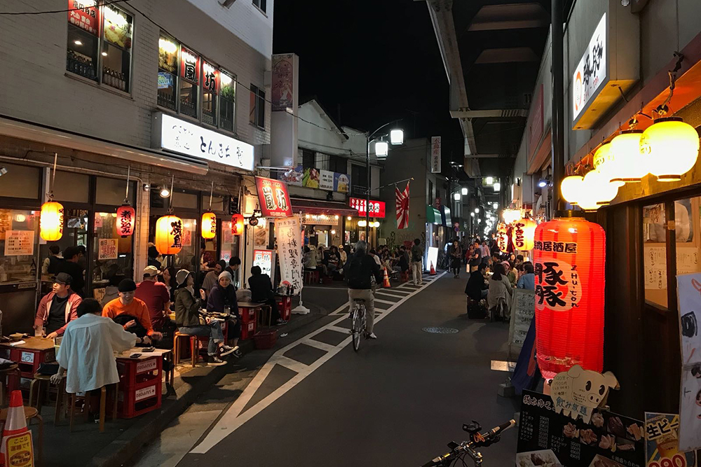 Beyond the clothes, Koenji’s nightlife is an attraction in itself. The neighborhood comes alive after dark, with alleys buzzing with energy. It is the kind of place where you go hunting for vintage clothes in the afternoon, then somehow find yourself staying out far later than you planned. Directly beneath the train tracks, with the concrete structure looming overhead, narrow streets are packed with restaurants, bars, and izakaya. Many of them spill out onto the road, their seats and tables create the feeling that you are walking through the establishments themselves.